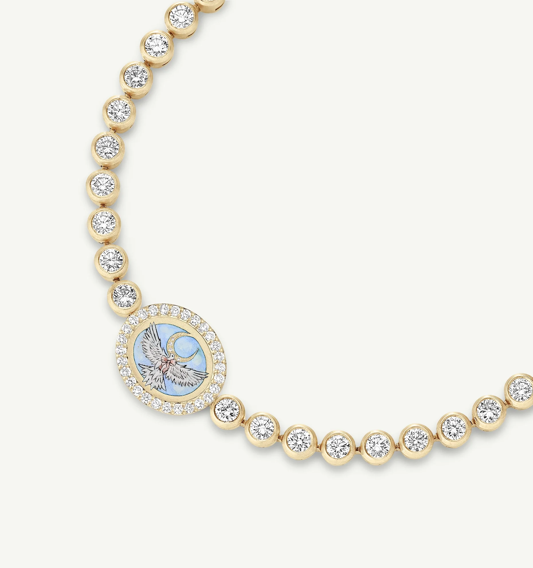 This miniature, hand-enamelled scene sits at the centre of an oval medallion in 18ct yellow gold, framed with an indulgent halo of pavé-diamond. Choose between a classic filed belcher chain or a row of bezel-set round diamonds, creating a subversive cross between classic tennis and identity bracelet styles.