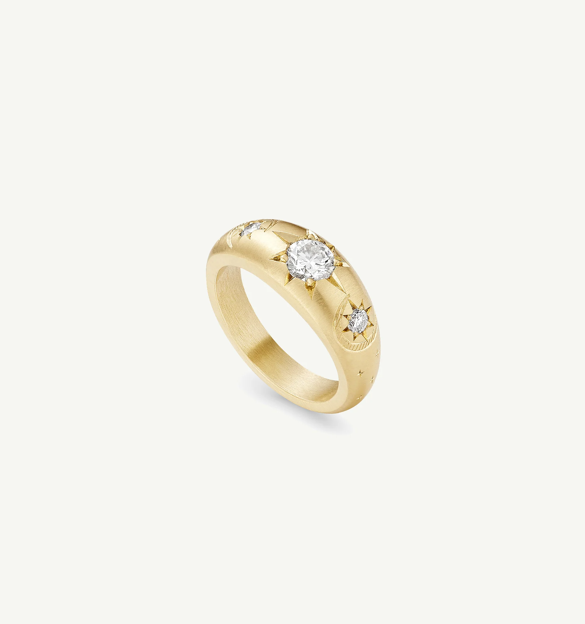 Cece’s Lucky Star collection is a storied twist on a timeless style. The tactile, domed Gypsy ring becomes a tattooed canvas, with hand-engraved detailing and precious stones. Symbols of luck, love, and magic create a personal totem of a classic piece.