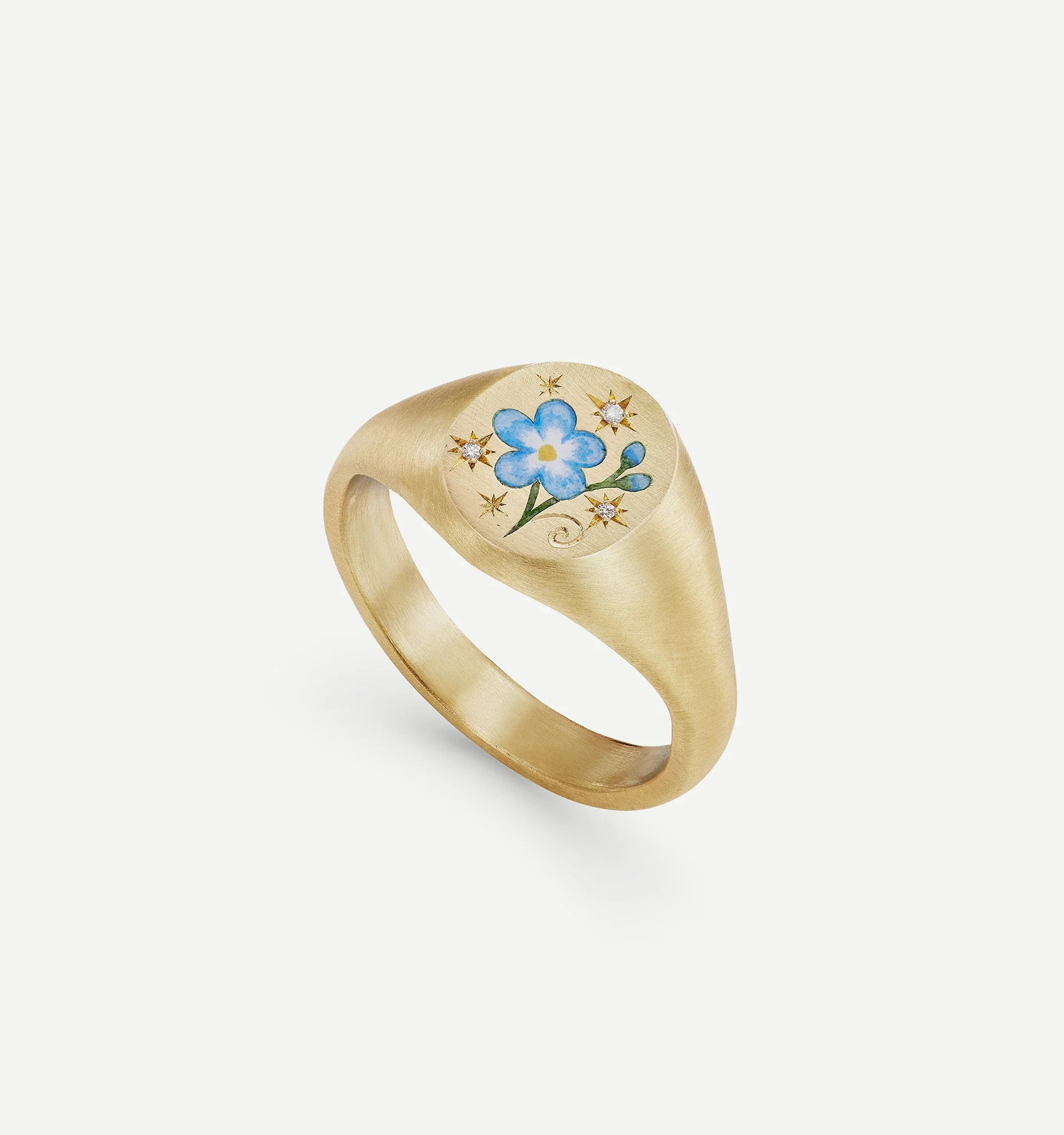 Found in the most ancient woodlands, forget-me-nots symbolise a love that will never die. Cece immortalises these fresh, blue blooms in enchanting, hand-painted enamel. Your symbol of unforgettable love, in a star-set diamond sky.
