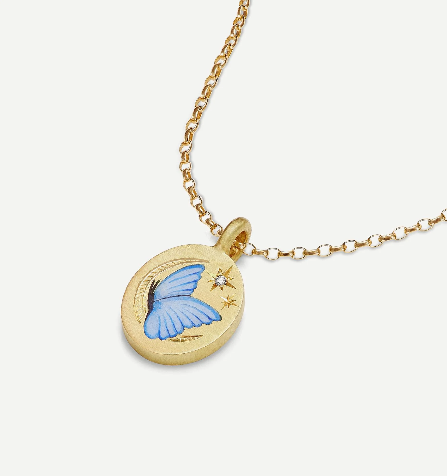 The Butterfly & Moon join two symbols of fleeting but wondrous beauty. A delicate blue-winged butterfly alights on a hand-engraved crescent moon in a twinkling diamond sky. Together, they remind us to keep our eyes open and marvel at small moments of wonder and beauty.