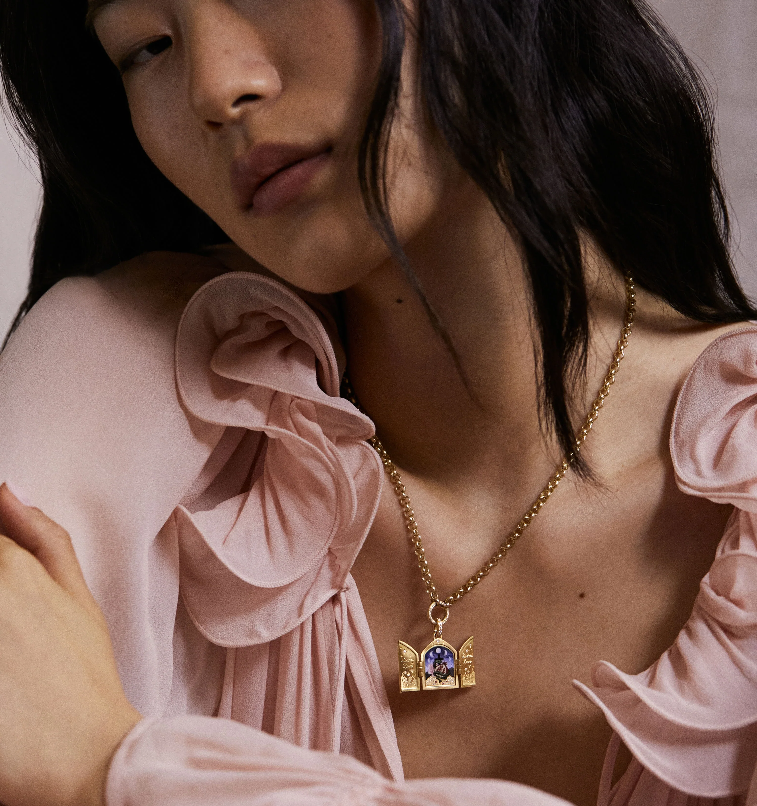 A wearable object de art realised in 18ct gold, hand-painted enamel, diamonds and rubies, the Underworld Triptych creates a sacred space, blanketed in stars. A feast of engraving, enamel and intricate stone-set detail, this extraordinary piece can be worn of the chain of your choice.