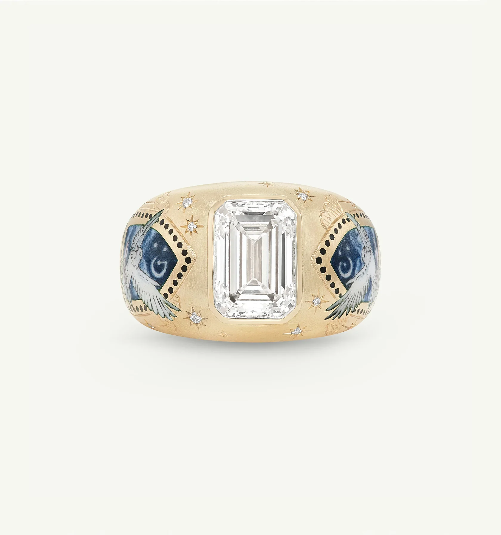 Inspired by the 18th-century Rodin sculpture The Kiss, the hand-enamelled painting captures a fleeting moment of connection on either side of the ring.